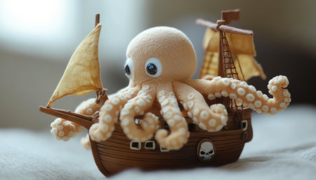 Plush octopus clinging to toy pirate ship