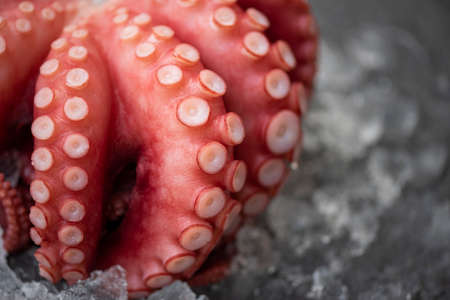 Fresh octopus on ice and dark background, Boiled whole octopus tentacles seafood squid cuttlefish