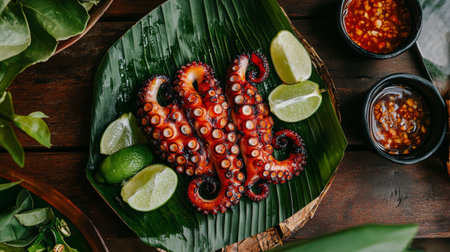 Grilled octopus resting on a banana leaf over a wooden table, accompanied by lime wedges and spicy dipping sauce for a Thai-inspired look