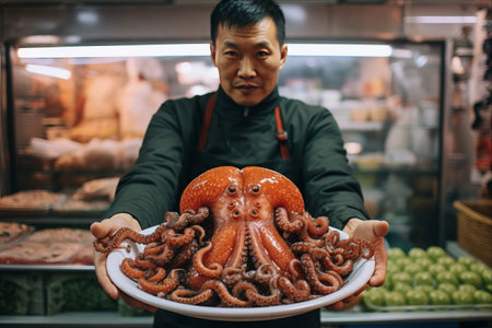 Captivating Presentation: A Seller Holding a Plate of Marinated Baby Octopus at a Fish Supermarket