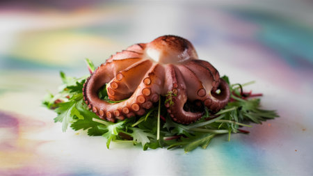 An octopus sitting on top of a pile of greens, AI