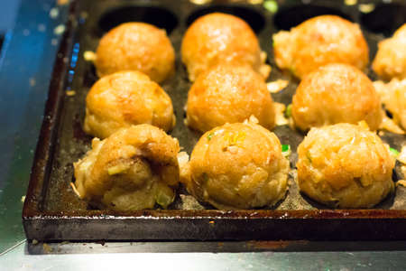 Japan street food, Takoyaki on hot pan close up