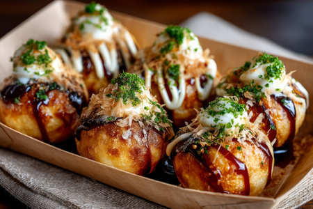 Close-up of delicious takoyaki balls drizzled with sauce and garnished with herbs, highlighting the vibrant colors and enticing texture of this popular Japanese street food.