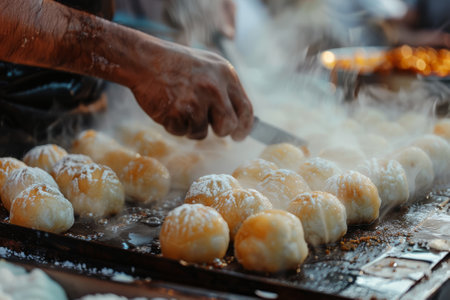 Street Vendor Showcases Freshly Prepared Dumplings at Busy Night Market in Asia During Vibrant Evening Hours Generative AI