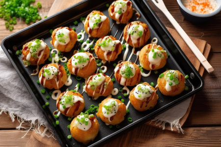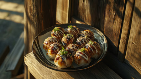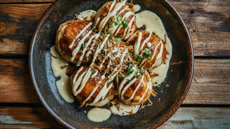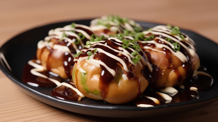 Savor the mouthwatering flavor of takoyaki, a popular Japanese snack, beautifully garnished with sauces and green onions on a rustic wooden table.