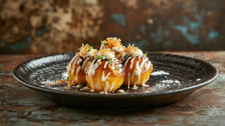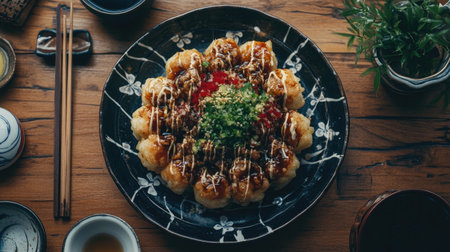 A vibrant scene showcasing beautifully plated takoyaki, topped with green garnishes and savory sauce, perfect for food lovers and culinary enthusiasts.
