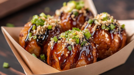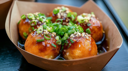 Indulge in a serving of delicious takoyaki topped with green onions and bonito flakes, capturing the essence of vibrant Japanese street food culture in this enticing image.