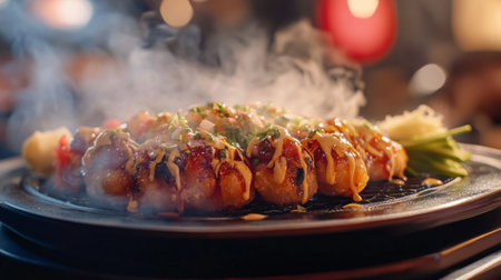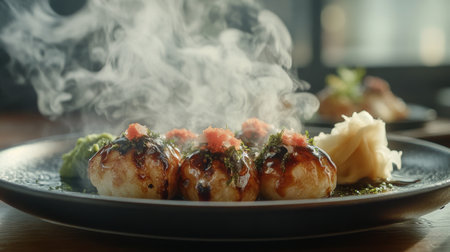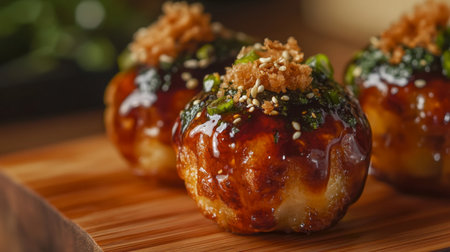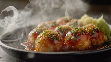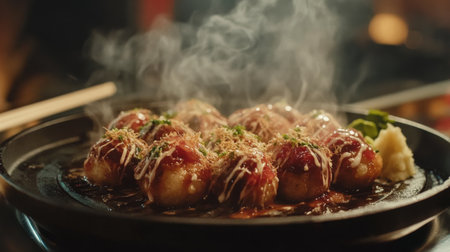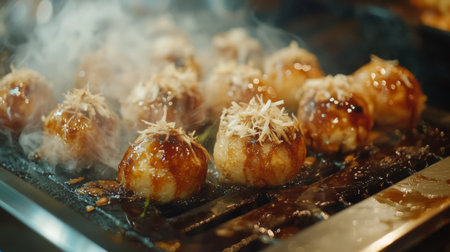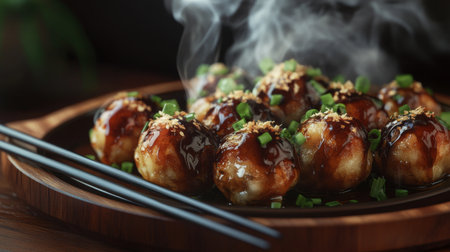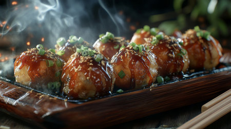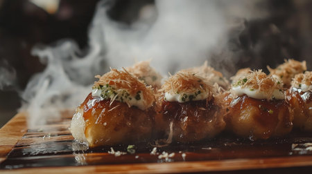 A close-up view of delicious takoyaki, a popular Japanese street food, served on a wooden platter with steam and various toppings enhancing its appeal.