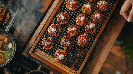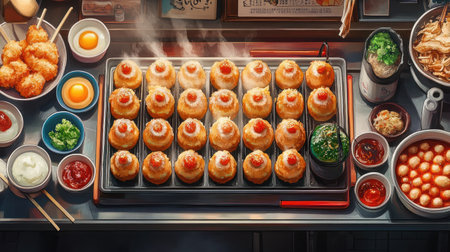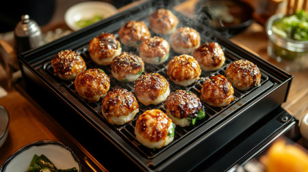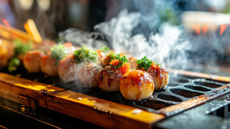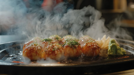 Sizzling grilled takoyaki served with wasabi and condiments, capturing the essence of Japanese street food in a smoky and inviting atmosphere.