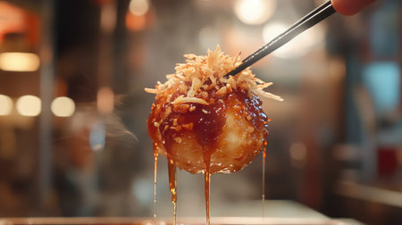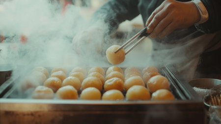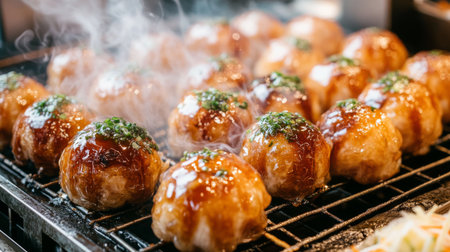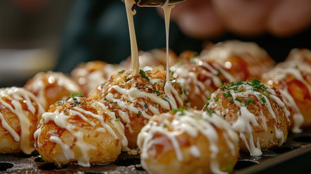 Experience the captivating sight of authentic takoyaki being grilled to perfection, topped with flavorful sauce and garnishes in a vibrant kitchen setting.