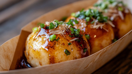 A mouthwatering display of takoyaki, freshly grilled and drizzled with savory sauce, garnished with green onions and bonito flakes, perfect for food lovers.