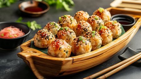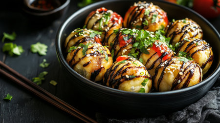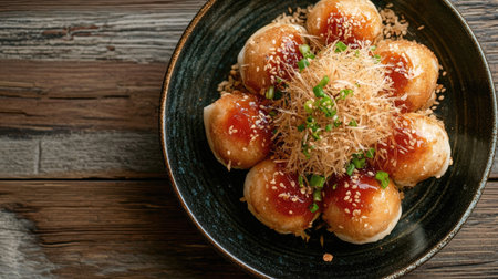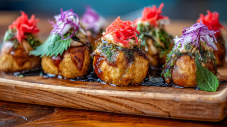 This captivating image showcases deliciously garnished street food balls, elegantly arranged on a wooden platter, featuring vibrant vegetables and fresh herbs.