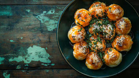A delicious display of baked dumplings topped with melted cheese and fresh herbs. Perfect for appetizers or a cozy meal. Ideal for food photography.