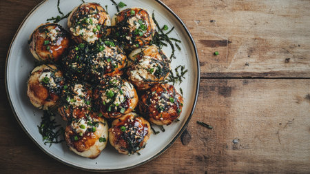 A plate of takoyaki topped with seaweed flakes and spicy mayo, beautifully presented on a wooden table, creating an inviting atmosphere for food lovers.