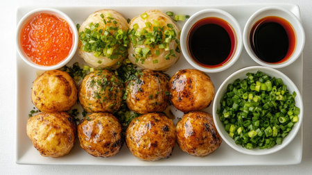 A colorful platter of takoyaki served with dipping sauces and chopped green onions, arranged artistically on a white background, highlighting the vibrant colors and textures.