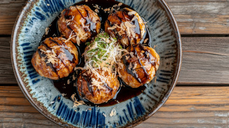A plate of exquisite takoyaki balls, drizzled with savory sauce, topped with bonito flakes and green onion. Perfect for showcasing Japanese street food culture.