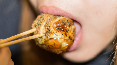 Woman Hand with Fried Takoyaki balls dumpling - japanese food