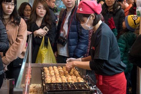 Osaka, Japan- 27 Nov, 2019: Vendor making takoyaki on a takoyaki pan in Osaka, Japan. Takoyaki is famous street food in Osaka.