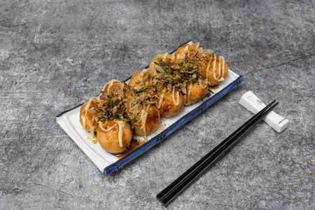 Japanese food Takoyaki or octopus balls topped with dried fish and seaweed on the grey concrete table.