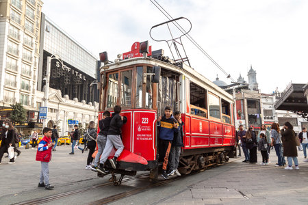 ISTANBUL, TURKEY - JANUARY 20, 2018: Historic Red Tram on Istiklal Street where the most popular destination of Istanbul for shopping and entertainment.