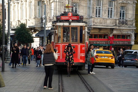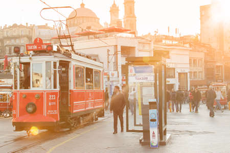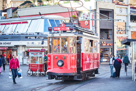 ISTANBUL, TURKEY - OCT 7: Vintage tram on the Taksim Street on October 7, 2014 in Istanbul, Turkey. Nostalgic tram of Istanbul is the heritage tramway system. It was re-established in 1990.