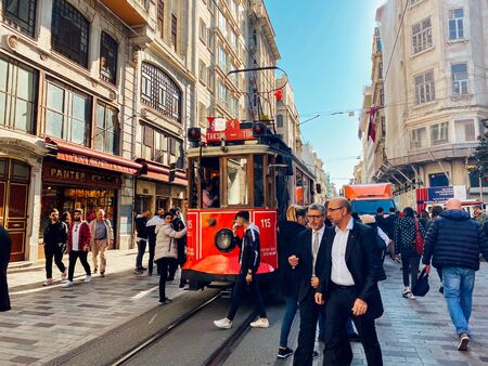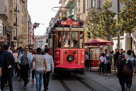 ISTANBUL, TURKEY – October 11, 2019 : Nostalgic traditional Red Tram in Beyoglu. Tramway line operates on Istiklal Street (popular destination in Istanbul) between Taksim Square and underground railway line - Tunnel.