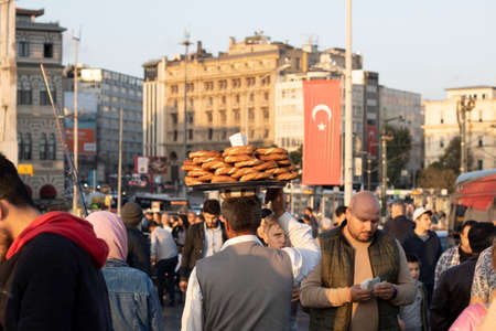 Istanbul, Turkey - October-27.2019: Man sells bagels in the tray on his head. Trying to make money. There are people around him.