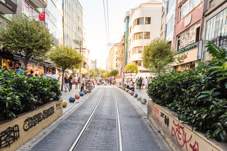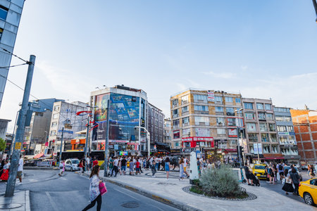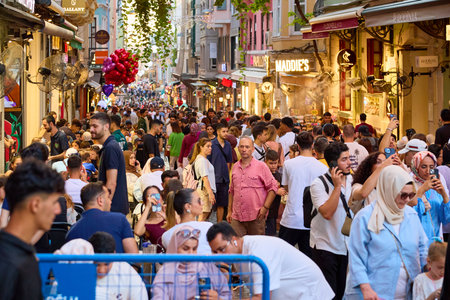 Vibrant street scene with diverse people in european city setting. August 11, 2025, Istanbul Turkey.