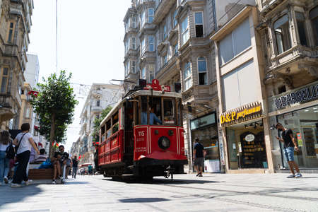 ISTANBUL, TURKEY - JULY 18, 2021: Iconic Taksim Tunel Nostalgia red tram on its way to Taksim Square