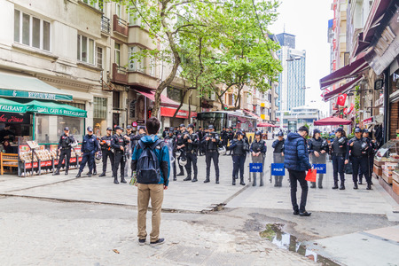 ISTANBUL, TURKEY - MAY 1, 2017: Riot police barriers near Taksim square, security measures for May Day in Istanbul.