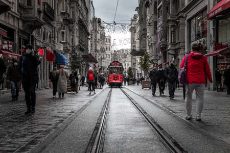 ISTANBUL, TURKEY - JANUARY 5, 2022: historic red Tram going via one of the most famous avenues in Istanbul - Istiklal Caddesi, Taksim quarters.