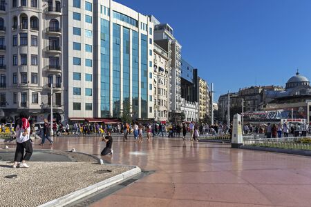 ISTANBUL, TURKEY - JULY 26, 2019: Walking people at Taksim Square at the center of city of Istanbul, Turkey