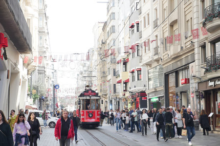 ISTANBUL, TURKEY - NOVEMBER 18, 2022: On Istiklal Street, one of the busiest streets of Istanbul, crowded people gather for shopping and sightseeing.