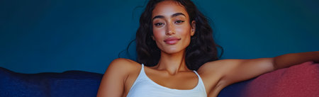 A young woman with long wavy hair lounges comfortably on a vibrant sofa. She wears a simple white tank top and exudes a relaxed confident vibe creating an inviting atmosphere.