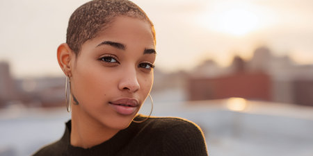 A young woman with a shaved head and hoop earrings looks directly at the camera with a soft expression as the sun sets behind her, casting a warm glow on her face and shoulders.