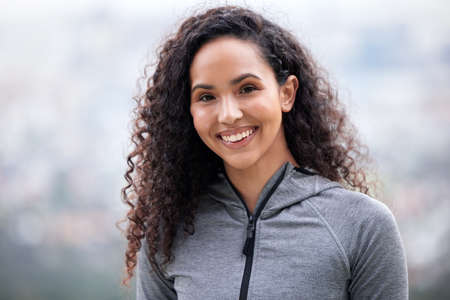 Close up portrait of a beautiful young woman with curly hair smiling.