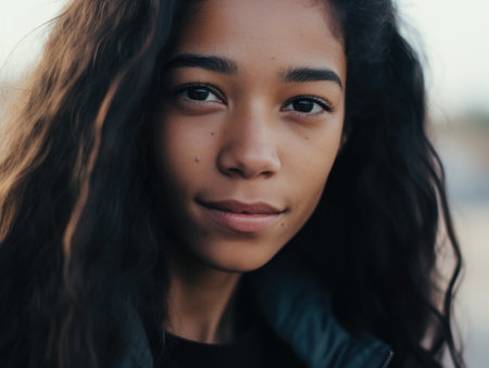 title: portrait of a thoughtful young woman with dark wavy hair, contemplative gaze, natural beauty concept, serene expression, indoor portrait with soft lighting