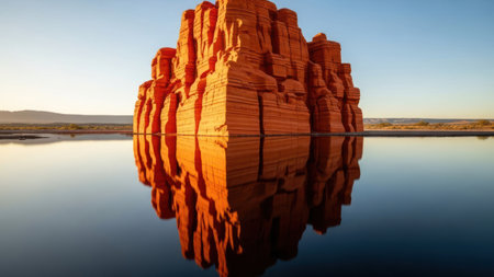 An orange rock formation stands tall, reflected in calm water. The scene showcases vibrant colors, including shades of orange and blue. The water's surface provides a mirror image, enhancing the composition. The natural lighting creates a striking contrast. This landscape offers a sense of tranquility.