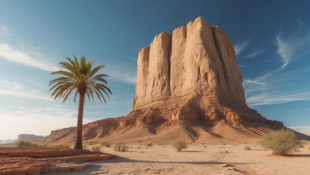AI Generated. A desert landscape with a large rock formation and a palm tree