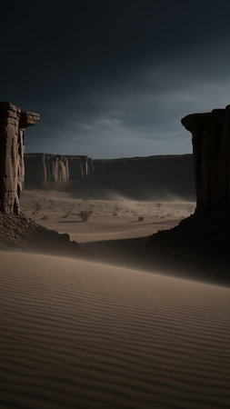 Dramatic desert landscape with towering rock formations framing a sandy canyon floor under a dark, cloudy sky.