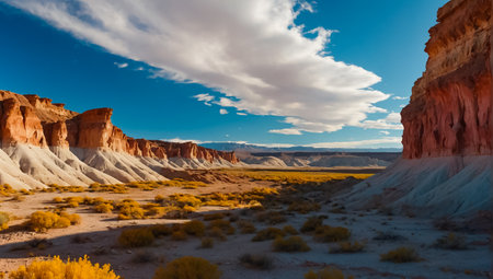 AI Generated. Scenic View of a Desert Canyon with Rugged Rock Formations Under a Blue Sky with Fluffy Clouds