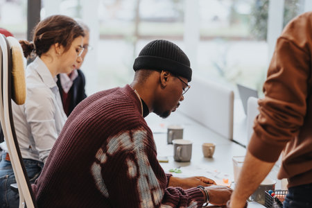Five multicultural creative workers gathering at bright office for planning and designing new business project. Diverse people working with charts and gadgets