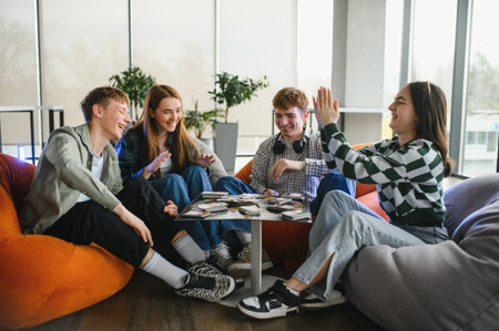 Group of cheerful young adults sitting on beanbag chairs around table, playing board game and giving high five, enjoying leisure time together