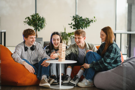 Four cheerful friends are sitting on beanbag chairs, enjoying their leisure time by playing a captivating wooden block tower game together