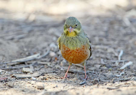 Close up photo of a male ortolan bunting stands on the ground.