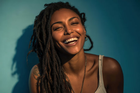 Joyful African American woman with dreadlocks smiles against a bright blue backdrop, capturing a moment of happiness and confidence in a vibrant portrait