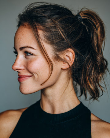 A young woman with light brown hair styled in a ponytail smiles softly. She has a natural beauty and a relaxed expression, set against a simple, neutral backdrop.