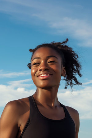 Portrait of smiling black woman in sportswear, doing sports outdoors against a blue sky background, professional photography