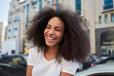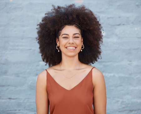 Portrait of cheerful woman with big afro and beautiful smile standing outside against a brick wall. Carefree woman posing outside during the day