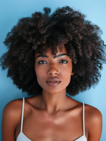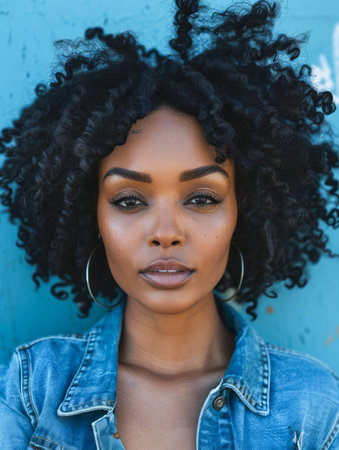 Confident Young African American Woman Posing Against Blue Textured Background with Natural Curly Hair AI Generative